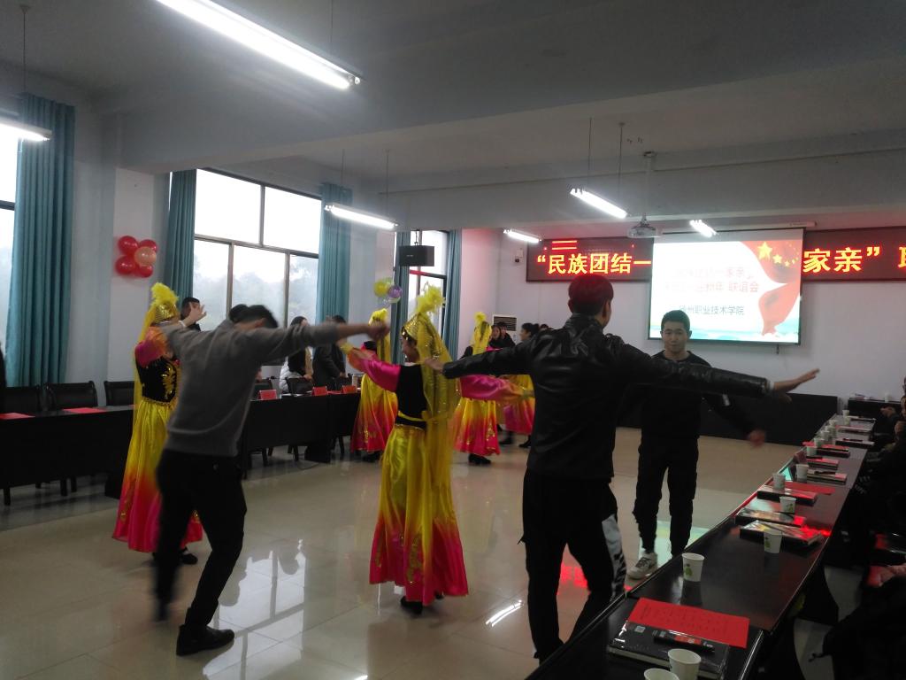 下午16:00联谊会在维吾尔族学生帕提曼·麦麦提的独舞《新疆吆喝》中正式开始,随后,节目表演开始,在演出中,新疆籍学生以歌舞的形式把党的民族政策与校园文化结合起来,用曼妙的舞姿把党委政府民族团结的声音及时传达到内地高校,不仅展现了新疆籍少数民族学生的热情,而且以丰富多彩的文化活动作为载体,表达出了“民族团结一家亲”的深刻内涵,充分体现了新疆少数民族学生热爱生活、积极向上的精神风貌。精彩纷呈、形式多样、欢乐喜庆的每一个节目给与会者们带来视觉上的享受,获得阵阵喝彩。