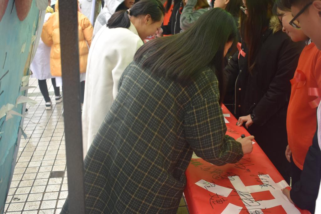 12月3日,vwin德赢ac米兰官方网医护学院在校内开展艾滋病日宣传活动,现场悬挂了“人人参与防艾行动,家家拥有幸福家园”、“手牵手同牵红丝带,心连心共防艾滋病”等标语十分醒目,师生们纷纷在横幅上签字,表示“预防艾滋,从我做起”,最后,师生们纷纷佩戴起红丝带,来表示他们对防治艾滋病的关心。