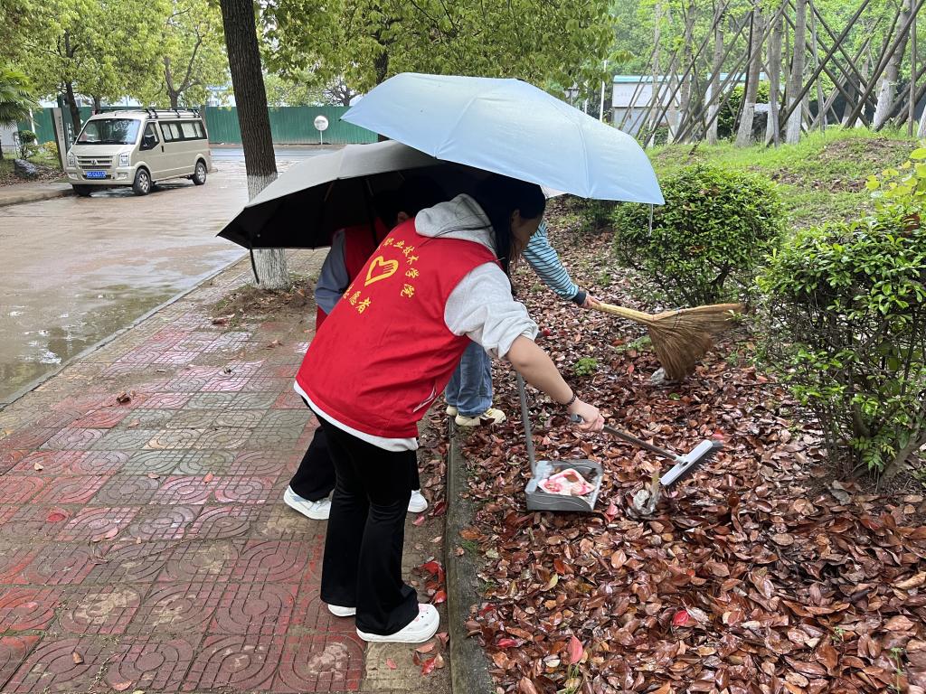 志愿者们在活动前分配好各自负责的区域,手持扫把、撮箕,热情洋溢的投入到清洁活动中。清扫枯枝落叶、打扫卫生死角、清洁白色垃圾……淅淅沥沥的雨给志愿活动增加了难度,也更加激励了志愿者们做好志愿活动的决心。在大家的共同努力下,校园环境面貌焕然一新。
