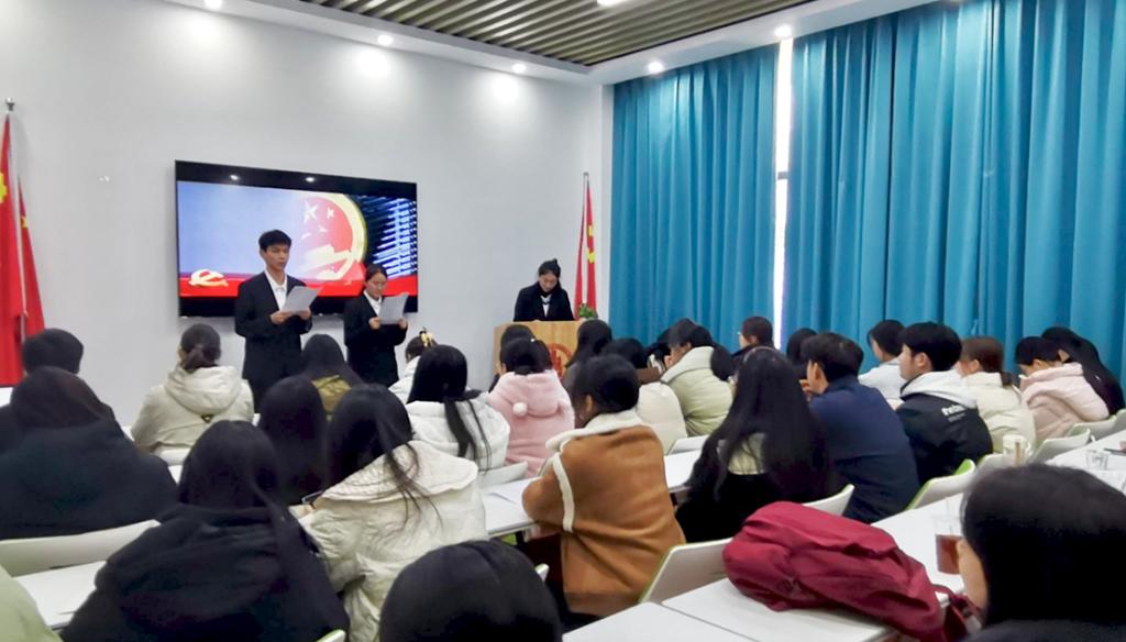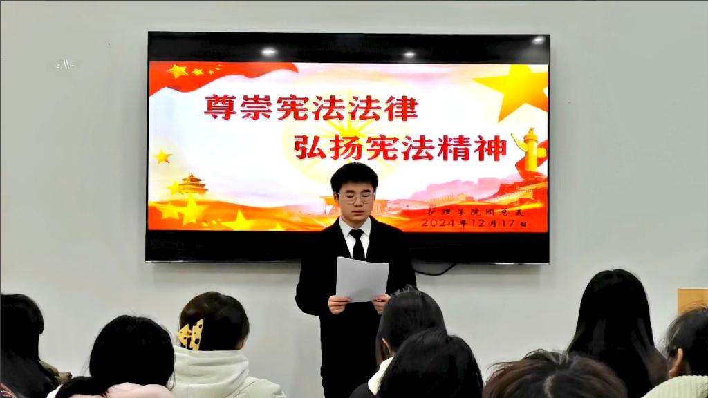 活动开始,主持人介绍了召开此次团日活动的意义和目的增强团员青年对宪法的认知与敬畏,为推动国家法治进程贡献青春力量,促进社会和谐稳定发展。紧接着全体人员奏唱团歌并观看“宪法的今生前世”相关视频,了解到宪法作为根本大法,它维系国家法治根基。随后,在团委干事袁蕊希精彩的演讲中,我们深入学习了宪法知识,紧接着团委干事彭垚,张雯雯带来的宪法朗诵进一步强化了法制观念。最后,本次团日活动在王老师的总结中圆满结束。