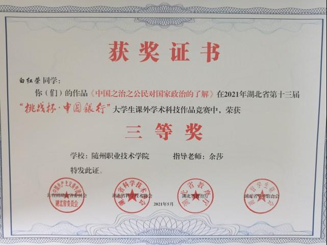 以党建带团建,实现全员育人。依托“三会一课”开展团员教育,深入推进“青年大学习”每周主题团课学习,加强团员教育。开展了“全民国家安全教育日”、“清明缅怀革命先烈”、“请党放心、强国有我”等主题团日活动,进一步坚定学生理想信念,使之成为能担当民族复兴大任的时代新人。多种形式的教育也提升了学生的知识水平,2021年白红荣同学荣获湖北省第十三届“挑战杯,中国银行"大学生课外学术科技作品竞赛三等奖;2021-2022年付存时同学连续2年荣获全国大学生环保知识竞赛优秀奖;2021年周婷婷同学荣获全国高校学生国家安全知识线上竞答优秀奖;2021年江玉灿同学荣获全国大学生“防灾减灾”安全知识竞赛决赛三等奖。