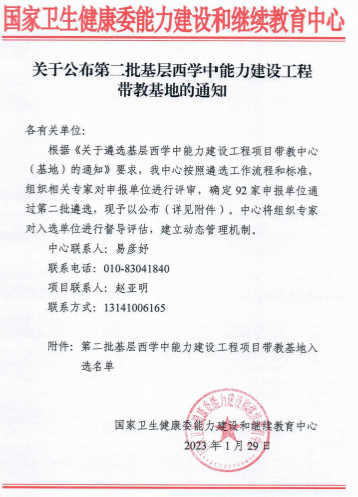 1月29日,国家卫生健康委能力建设与继续教育中心公布了第二批基层西学中能力建设工程带教基地名单,全国共有92家单位获批,德赢榜上有名。